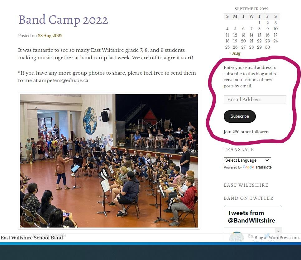 In order to support students, parents are asked to please subscribe to the band website in order to receive emails about upcoming events, rehearsal schedule, updates, etc. (see pictures below). I like to keep all of the band information in one easy to find place, so I don’t usually send mass emails through PowerSchool after the first week or two. If you have any questions at all about receiving emails through the website, please let me know and I will be happy to help.